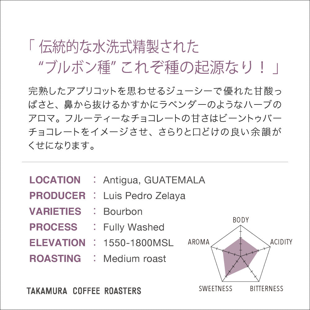 熟度が高く、脂質やショ糖の含有量が多いので焙煎によるカラメル化が起きやすいのが最大の特徴です。ショ糖が多いので色づきやすく、深煎りだけど、あまり時間をかけずに焙煎することができます。なので過度にストレスがかからず、明るいフレーバーを感じることができ、甘さと質感のバランスの良さを体感できます。